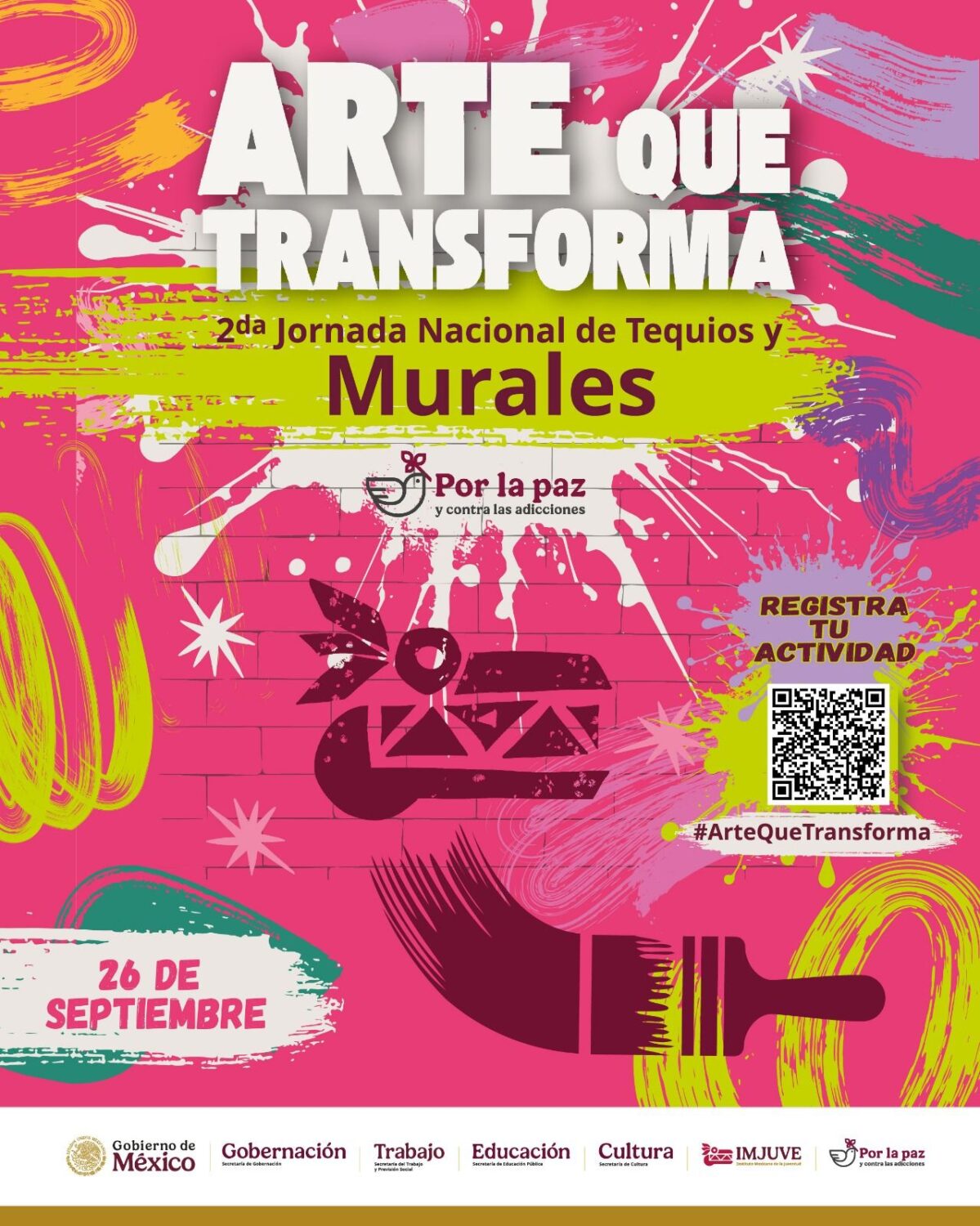 Ciudad de México, a 24 de septiembre de 2025. – Este viernes 26 de septiembre muros de todo el país se llenarán de colores, mensajes y manos jóvenes. El Instituto Mexicano de la Juventud (IMJUVE) convoca a jóvenes de los 32 estados de la República a sumarse a la 2ª Jornada Nacional de Tequios y Murales por la Paz y Contra las Adicciones: #ArteQueTransforma.