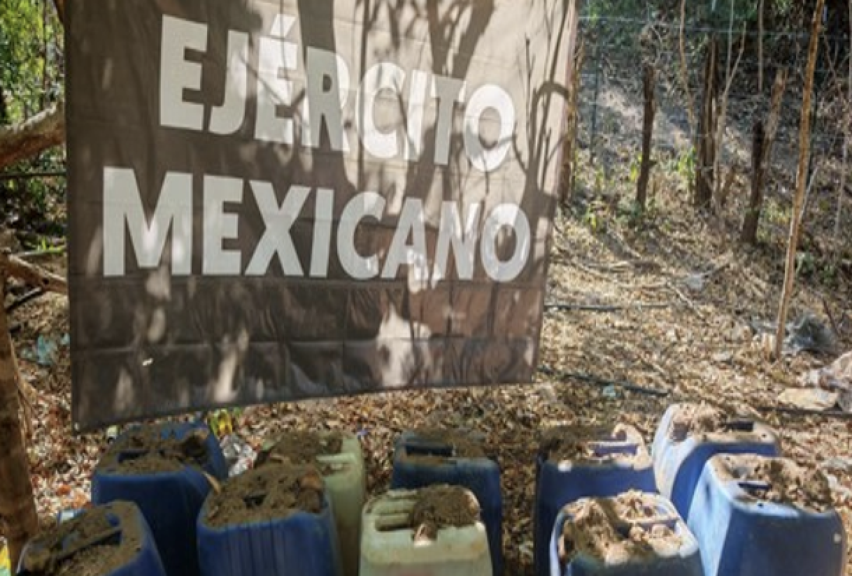 -En Culiacán y Cosalá, elementos del Ejército Mexicano localizaron ocho áreas de concentración de material diverso para la elaboración de metanfetamina, donde aseguraron 2 mil 500 litros de sustancias químicas y un reactor de síntesis orgánica.