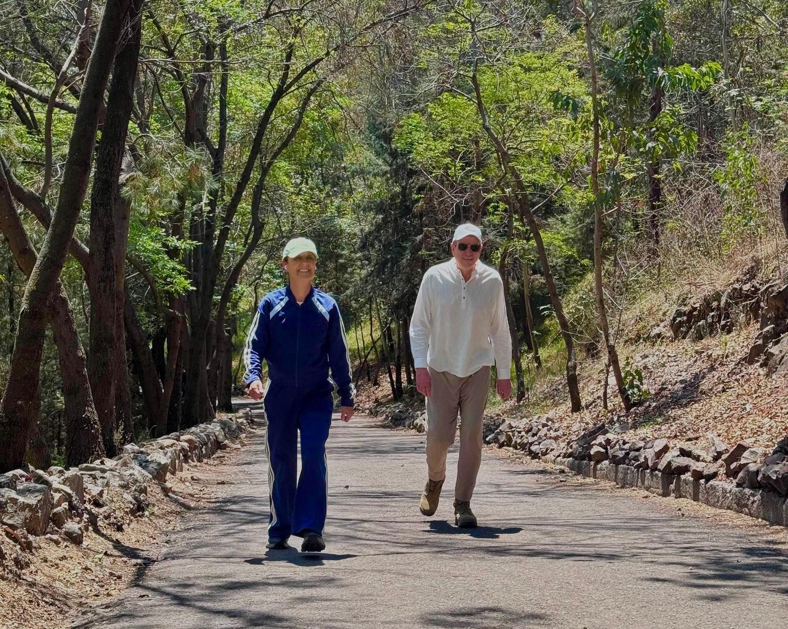 Ella aparece vestida con ropa deportiva de color azul y él con vestimenta casual, ambos portan gorras para protegerse de los rayos solares.
