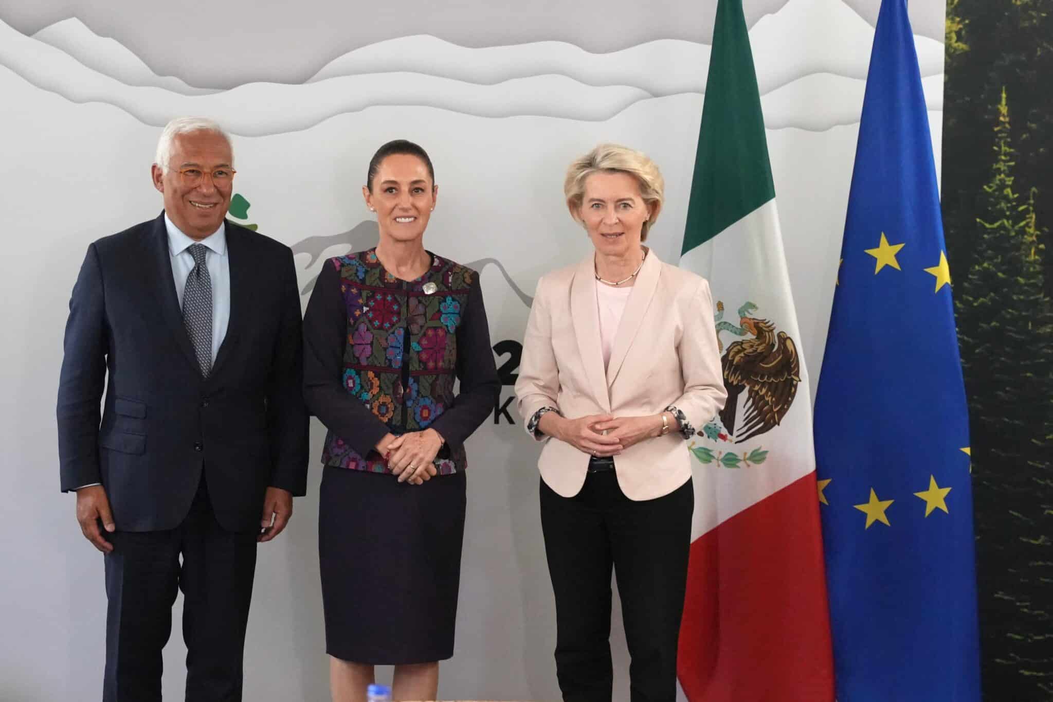 “En el G7, nos reunimos con el presidente del Consejo Europeo, António Costa @eucopresident, y la presidenta de la Comisión Europea, @vonderleyen, para dialogar sobre la actualización de nuestro tratado comercial. La invité a visitar México”, compartió a través de sus redes sociales.