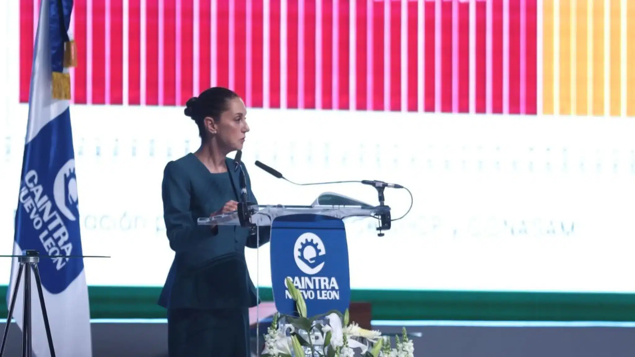 Durante su intervención, felicitó a Jorge Santos por su nombramiento como el nuevo presidente de CAINTRA Nuevo Léon.