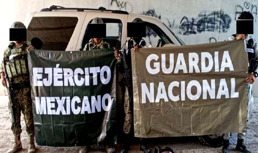 Se detuvo a cuatro personas, se aseguraron cinco cargadores, un arma de fuego corta, 32 cartuchos, 192 dosis de metanfetamina, 115 dosis de marihuana, 33 dosis de cocaína, dos vehículos y una motocicleta con reporte de robo en Estados Unidos y ponchallantas.