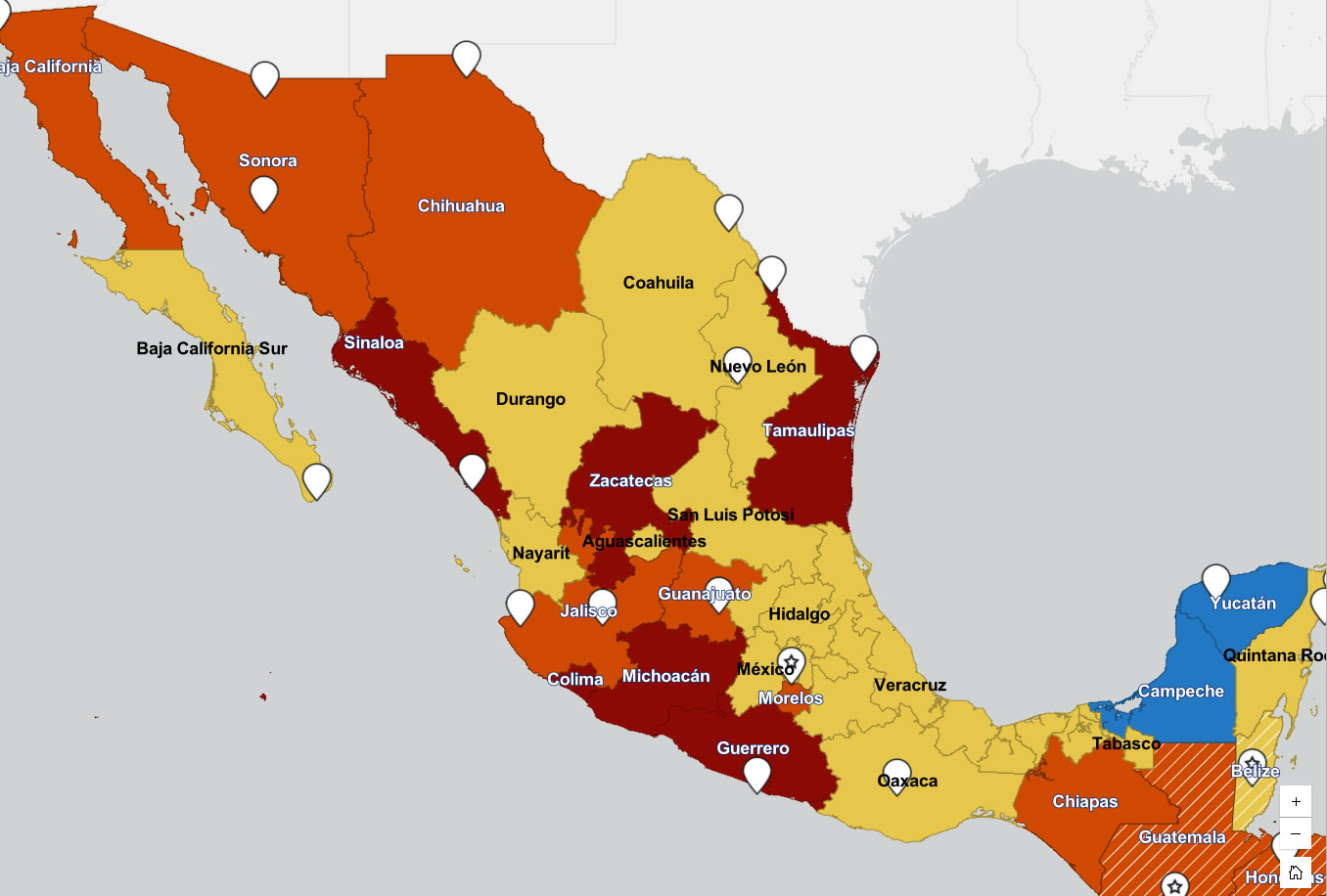 Los estados con nivel 4 son Sinaloa, Zacatecas, Tamaulipas, Colima, Michoacán y Guerrero.