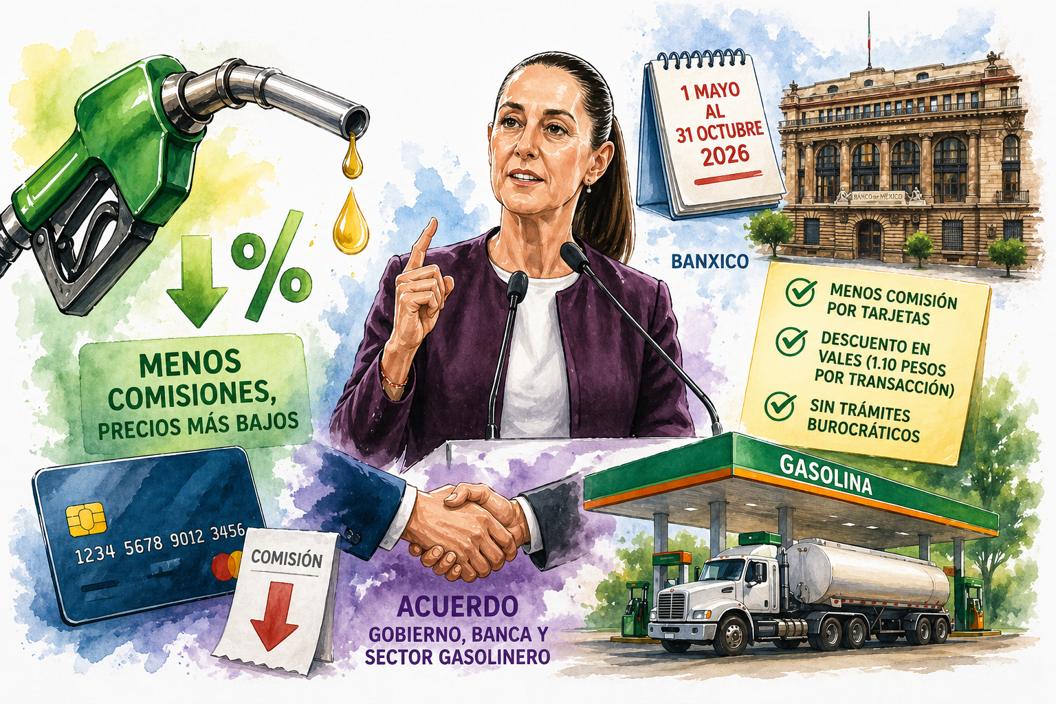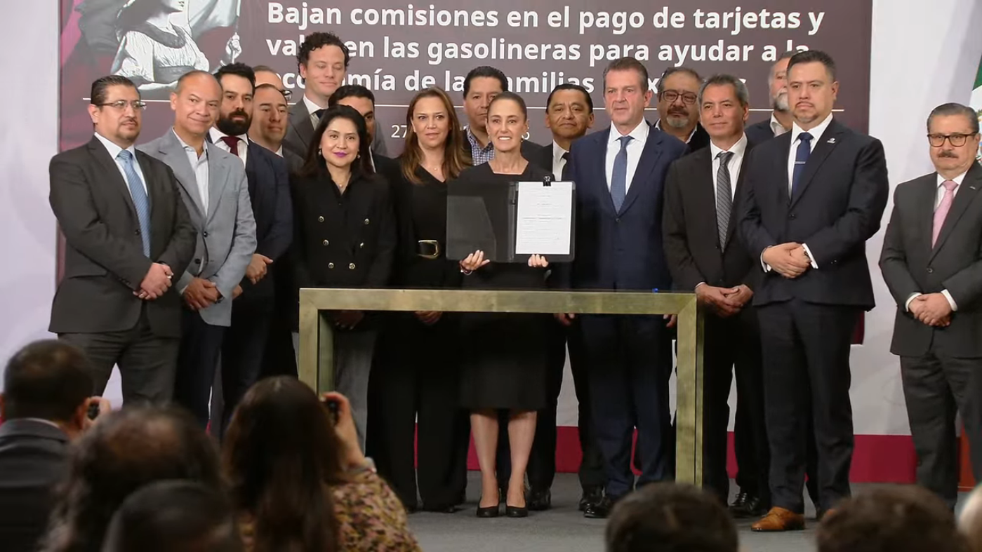 La presidenta de México, Claudia Sheinbaum Pardo, anunció la reducción de comisiones en los pagos de gasolina y diésel, tanto con tarjetas bancarias como con vales, como parte de un acuerdo coordinado por la Secretaría de Hacienda y en el que participó el Banco de México y diversas asociaciones.