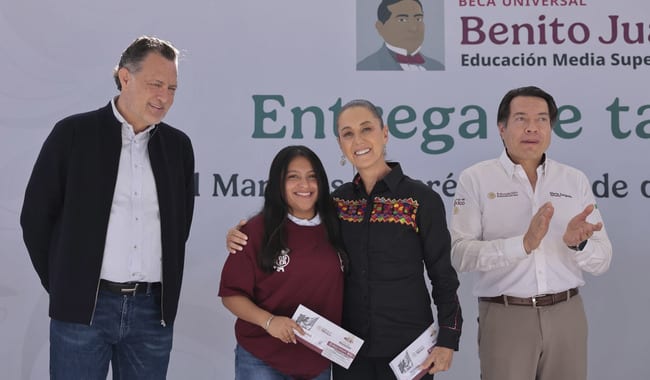 En Querétaro, la Presidenta de México, Claudia Sheinbaum Pardo, encabezó la entrega de tarjetas de la Beca Universal para la Educación Media Superior “Benito Juárez” y supervisó la construcción del nuevo Centro de Bachillerato Tecnológico Industrial y de Servicios (CBTIS) No. 304, en el municipio de El Marqués, que tiene un 90 por ciento de avance y estará listo el 27 de diciembre para ser inaugurado en febrero, y con ello cumplir el sueño de que las y los jóvenes vayan a la preparatoria y accedan a la educación como un derecho.